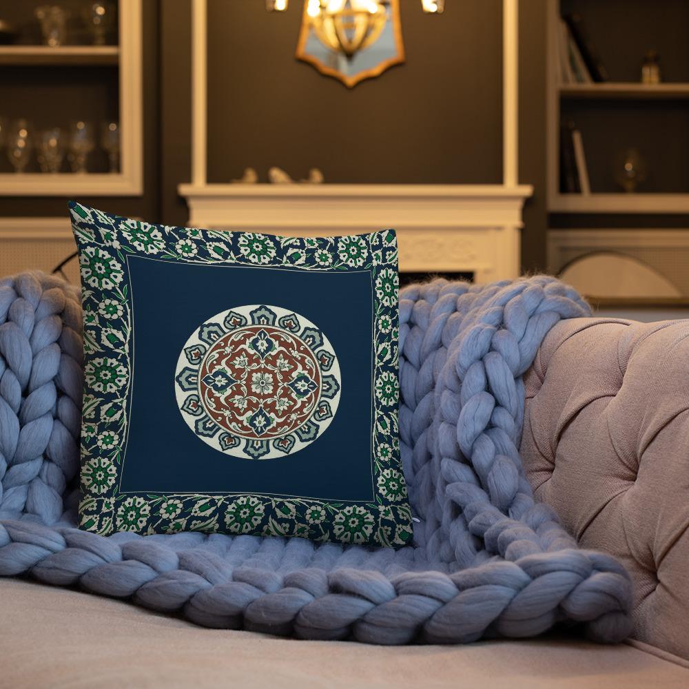 Antique Art Print Decorative Throw Pillow & Cushion Turkish Inlay Floral Circle Motif motif adorned the walls of the private quarters of Mughal Emperors, and now can add to your decor. This premium feel cushion works great for all décor ideas – indoor and outdoor, for the living room, bedroom or the patio. Available in 18in x 18in and 22in x 22in sizes.